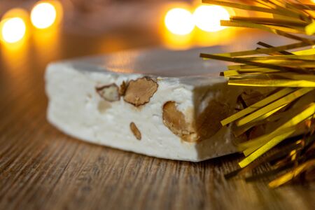 nougat on a wooden background with lights and Christmas decorations