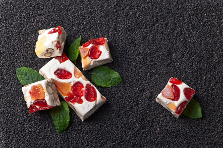 Soft nougat with tropical fruit on black sesame