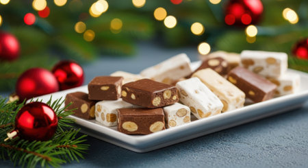 A variety of nougat pieces are arranged on a white plate, surrounded by Christmas ornaments and evergreen branches, creating a festive holiday scene.