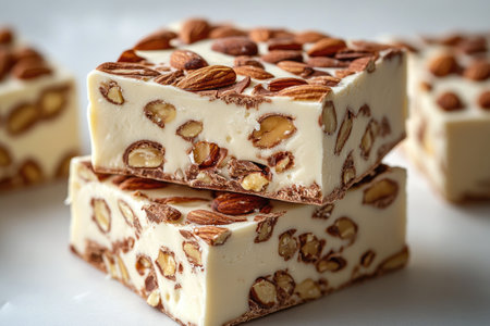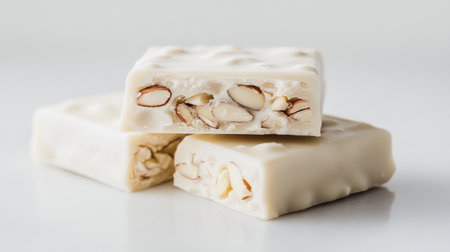 A beautifully arranged stack of creamy almond nougat bars on a simple white background, highlighting their texture and ingredients, perfect for dessert lovers.