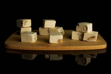 Lot of whole sweet white nougat on bamboo cutting board isolated on black glass