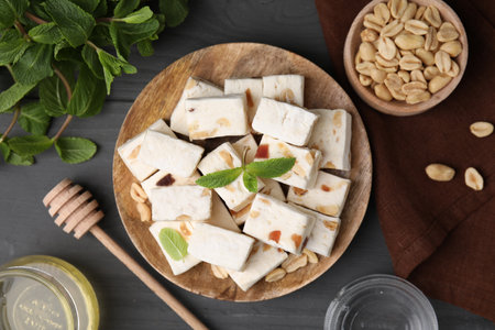 Pieces of delicious nutty nougat, peanuts, mint and honey on gray wooden table, flat lay