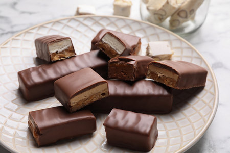Tasty chocolate bars with nougat on table, closeup