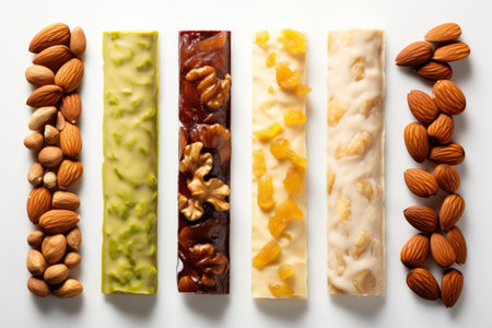 minimalist tableau featuring sugar-free date and nut bars, set against a pure white background.