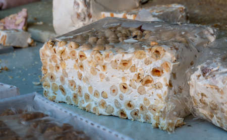Large portions of home made Nougat confectionary made with sugar or honey, almonds and dried fruits, covered in plastic, displayed for sale at a traditional street food market