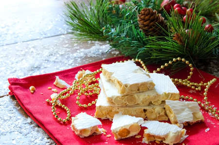 Turron, typical Christmas sweet in Spain. Almond nougat on red napkin on dark wooden background with snow and fir tree.