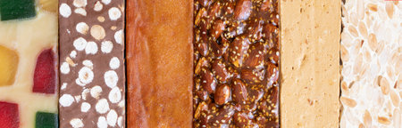 Different Spanish turron or nougat, hard almond, soft almond, chocolate, burnt egg yolk guirlache, glace fruit nougat. Spanish Christmas sweet large background.