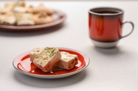 Eastern Arabic nougat sweetness with pistachios on a ceramic plate on a light background. Close up