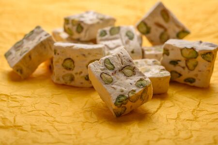 Eastern Arabic nougat sweetness with pistachios on yellow paper background. Close up