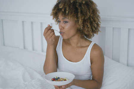 Beautiful romantic model with curls chilling on bed having healthy meal and looking away dreamily while eating.