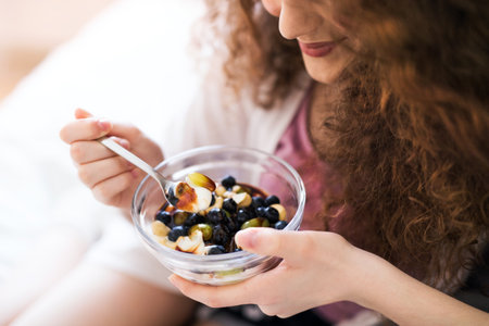 Beautiful young woman with curly hair eating yogurt bowl with fresh fruits as breakfast. Close up.