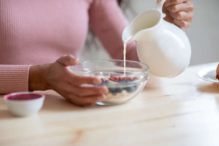 Unrecognizable Female Preparing Muesli With Fruits For Breakfast, Pouring Milk To Bowl