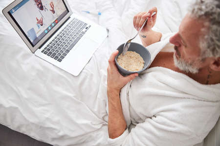Closeup cropped shot of unrecognizable male hospital patient in medical coat resting, eating, gaining strength before long operation in clinic. Man enjoy eating food sitting at table in hospital room.