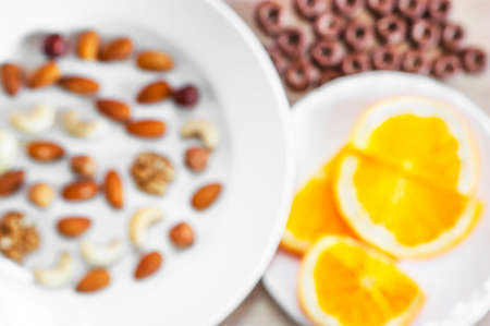 Assorted Nuts, Orange Slices On White Plates, Crunchy Whole Grain Cereals Round Oats On Wooden Table. Healthy Organic Snack, Breakfast, Food Ingredients. Flat Lay Top-Down Composition.