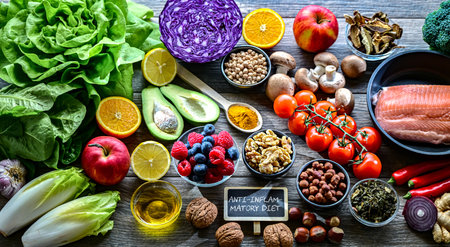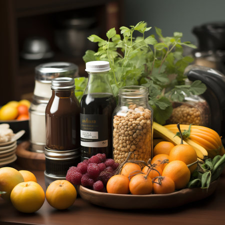 Displaying fresh fruits and vegetables on kitchen countertop, with glass jar of juice, metal grater. Healthy, organic, rustic, vibrant, natural, nutrition, wellness
