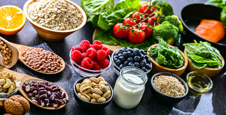 Healthy food selection with fruits, vegetables, seeds, superfood, cereals on wooden table