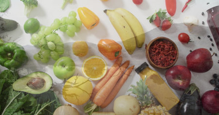 Healthy eating ingredients: fresh vegetables, fruits and superfood. Clean eating and detox. Nutrition, diet, vegan food.