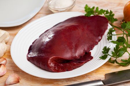 Raw liver ready to Cook on a wooden board in the rustic kitchen, cooking process. Concept of healthy eating
