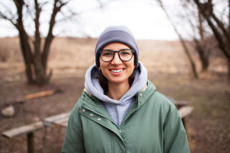 Close-up outdoor portrait of young smiling girl in hoodie sweater and jacket.