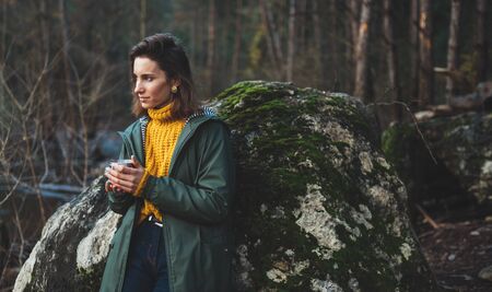 tourist traveler think relax green forest landscape, woman hold drink hot tea rest nature trip, hiking leisure