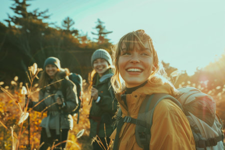 In the bright sunny day group of friends are enjoying their walk at autumn forest.