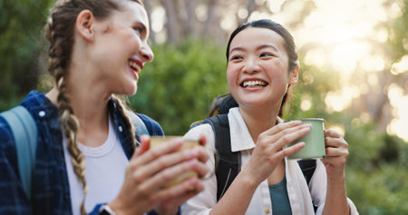 Travel, coffee and hiking with friends in nature for lunch break, trekking adventure and park conservation. Drink conversation and environment with women in forest for tea, relax and peace together