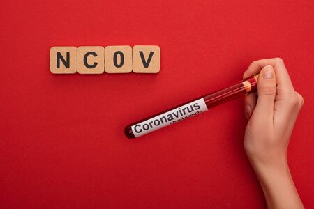 Top view of woman holding test tube with blood sample and coranavirus lettering near wooden cubes with ncov letters on red background