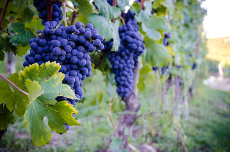 Bunch of blue grapes in the vineyard at sunset before harvest. Close-up