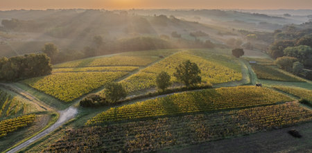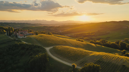 Aerial view of Tuscany vineyard at sunset, Italy