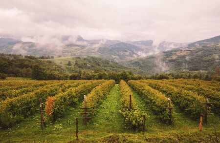Misty Vineyard Autumn Landscape Rows of Vines Foggy Morning Rural Scenery way farm wine fall dark
