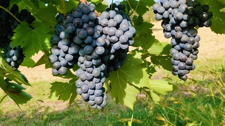 Blue wine grapes. Grapes for making wine. Detailed view of Cabernet Franc blue grape vines in the hungarian vineyard in autumn, Hungary