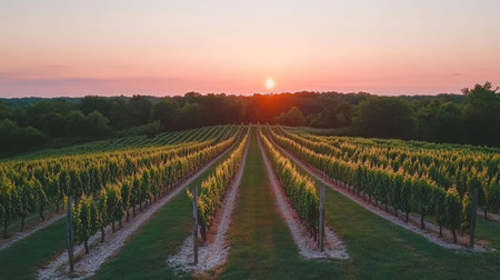 A scenic vineyard is illuminated by the warm glow of the setting sun, highlighting the neatly arranged rows of grapevines stretching across the landscape.