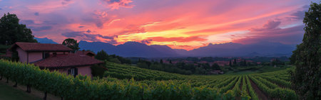 The vibrant sunset casts stunning colors over the Franciacorta vineyards, highlighting rows of grapevines and rustic farmhouses that capture the beauty of Lombardy's agricultural heritage.