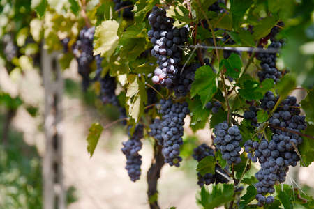 Bonarda or Charbono grapes growing in Piedmont, Italy. Beautiful vineyards in summer. Copy space