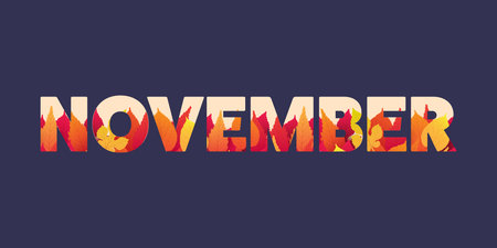 Dark November Typography or Banner Design, Template with Colorful Leaves. Colors: Red, Orange, Brown - Vector Template Design Isolated on Black Background - Design Element for Calendar or Web