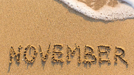 Inscription NOVEMBER on a gentle beach sand with the soft wave (months of the year series)