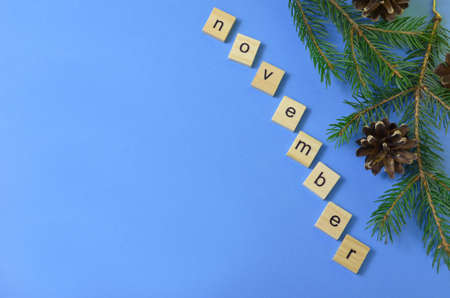 The month of November is written in wooden letters. The calendar. Spruce twig.