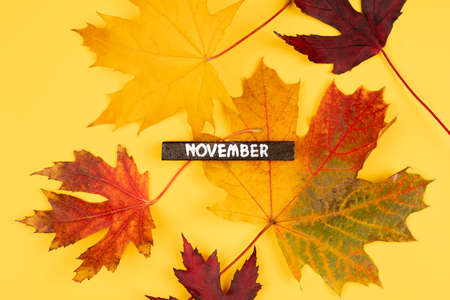 colorful background of autumn maple tree leaves background with wooden calendar November month. Multicolor maple leaves autumn background. High quality resolution picture