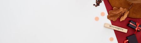 panoramic shot of hat, decorative gift box, padlock, coffee grains, dry leaf, wooden block with november inscription and red paper isolated on white
