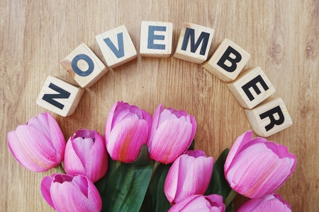 november alphabet letters with flower bouquet on wooden background