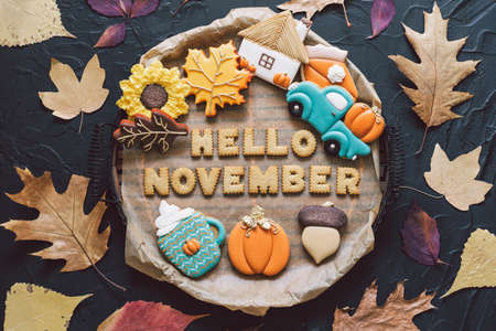 Hello November. Multicolored autumn cookies on a black background. Autumn concept