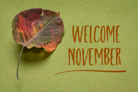 welcome November handwriting on handmade green rag paper witha dried leaf of Asian pear tree, season concept