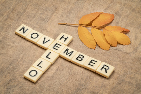 Hello November crossword in ivory letter blocks with a yellow leaf, fall holidays concept