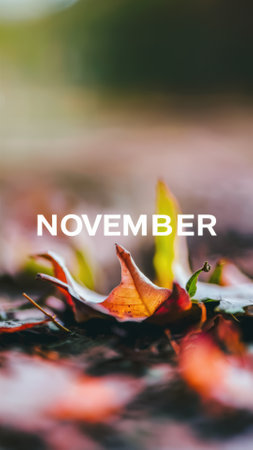 Autumn leaves in the park with the word November. Autumn background