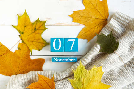 November 7th. Blue cube calendar with month and date on wooden background.