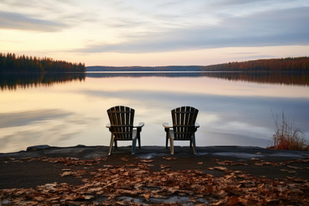 scenic view of a calm lake with two empty chairs by the shore, created with generative ai