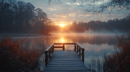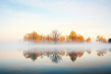 A stunning misty lake landscape featuring a serene atmosphere with trees reflecting on calm water. The early morning light creates a peaceful scene, perfect for nature lovers.