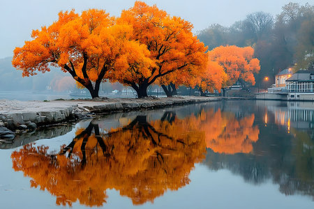 Vibrant autumn trees reflect on a calm lakeside, creating a picturesque scene perfect for seasonal design. the vivid orange foliage contrasts beautifully with the serene water, capturing the essence of fall tranquility. Generative AI