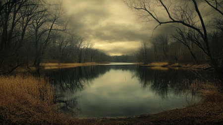 A tranquil forest lake reflecting dark clouds on an overcast autumn day in natural setting