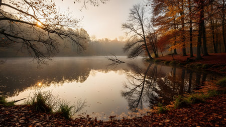 A beautiful autumn landscape captures a still lake surrounded by forest trees with vibrant orange and red foliage, under a misty, bright sunrise or sunset. The bare branches of the trees and the reflection in the water create a dramatic and serene seasonal scene.